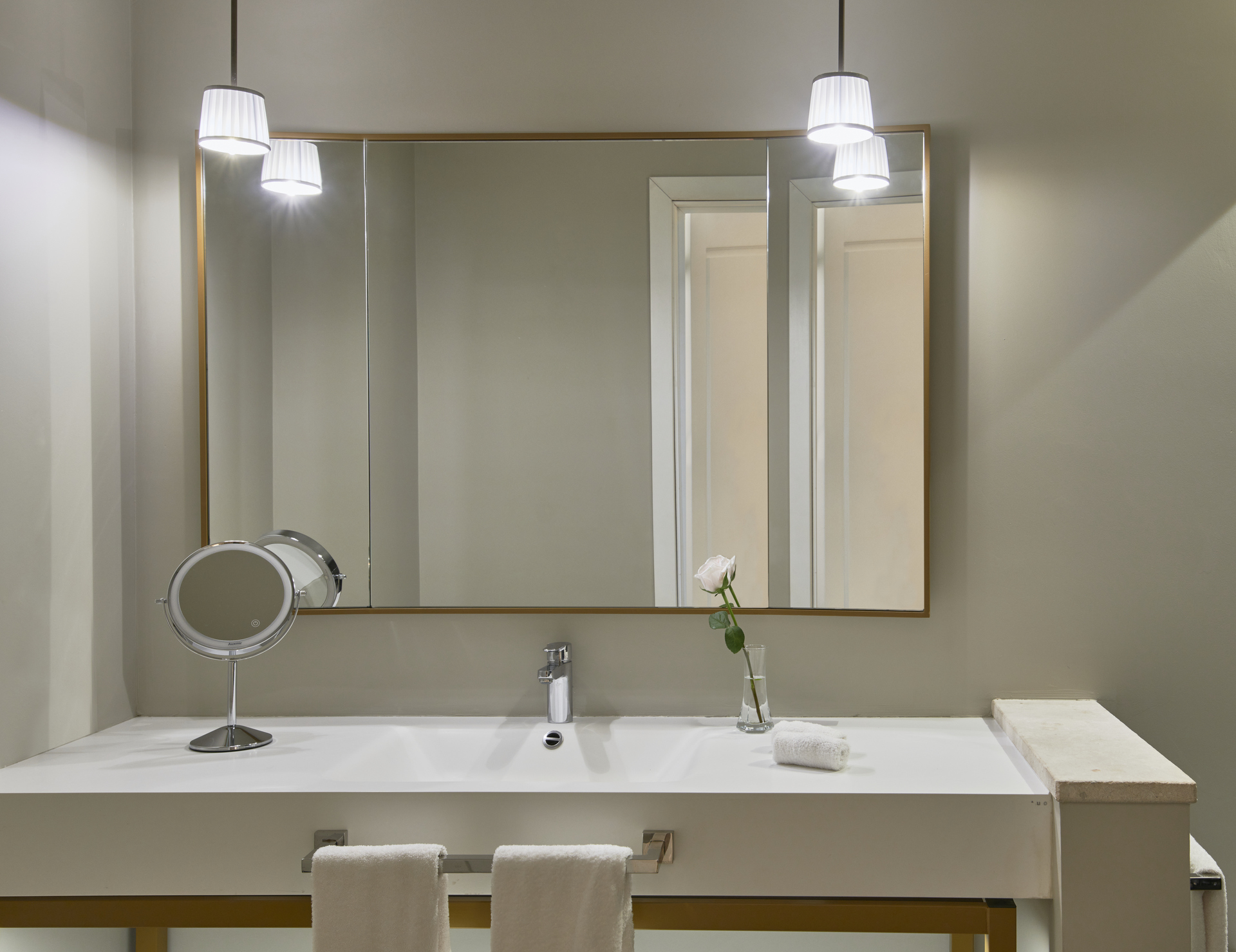 Il bagno è impreziosito da pietra naturale, in sfumature tenui e calde, e dotato di prodotti di cortesia Byredo, accappatoi e pantofole.