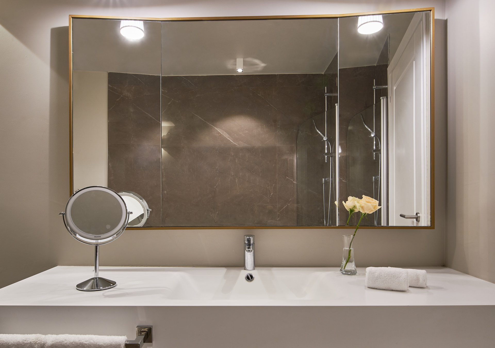 The bathroom has natural stone and golden light colours and Byredo amenities.