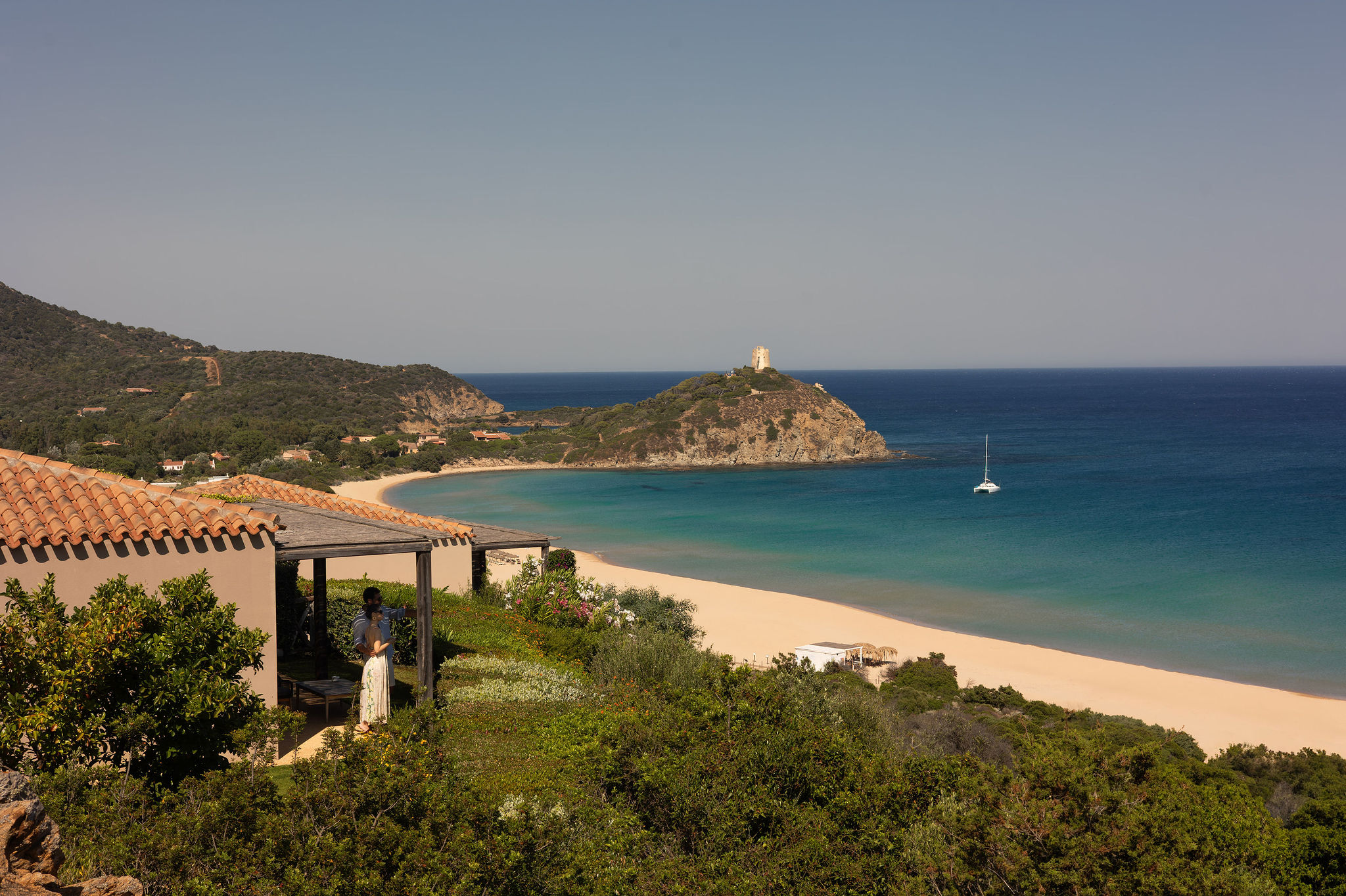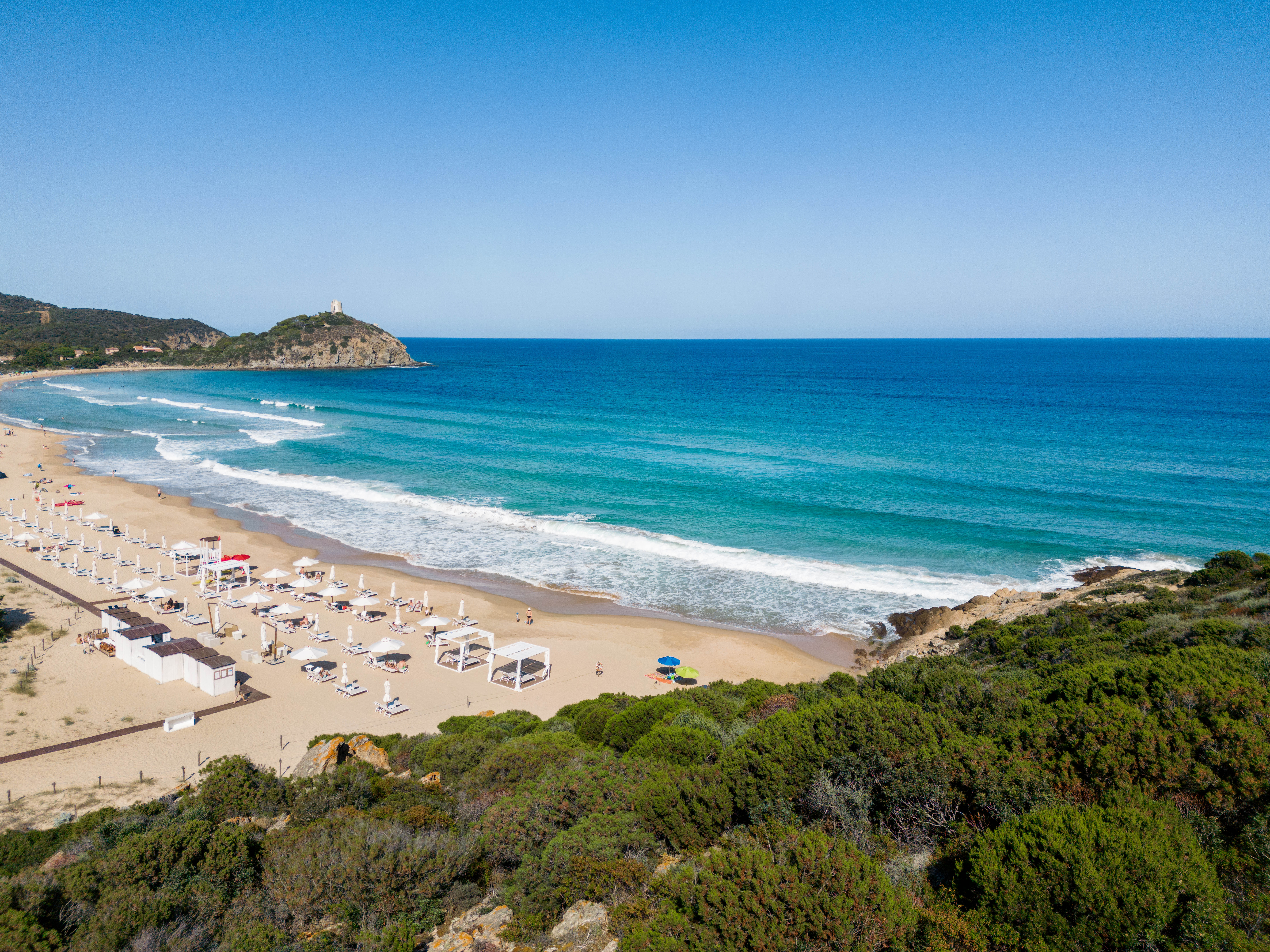 Monte Cogoni Beach is a true natural gem: a sweeping stretch of golden sand that meets the crystal-clear waters of the bay, all framed by the striking Chia Tower above.