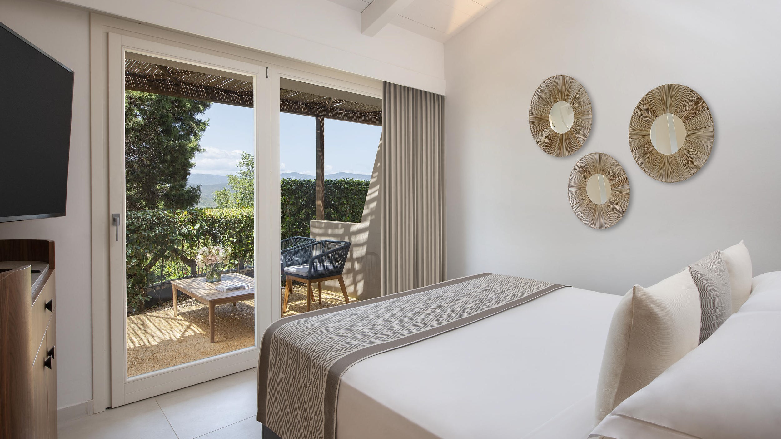 L’unione di elementi mediterranei tradizionali e oggetti di design con luci lineari rende questa camera un luogo perfetto in cui rilassarsi. Accomodatevi sulle sedie a sdraio della terrazza privata, godendovi la vista su lentischi, ulivi selvatici e cespugli di mirto. Tutte le camere di questa categoria presentano un letto king size, la possibilità di aggiungere una culla previa richiesta, un televisore ad alta definizione, una macchinetta del caffè, un bollitore per il tè, Wi-Fi gratuito, pantofole, prodotti di cortesia Culti.
