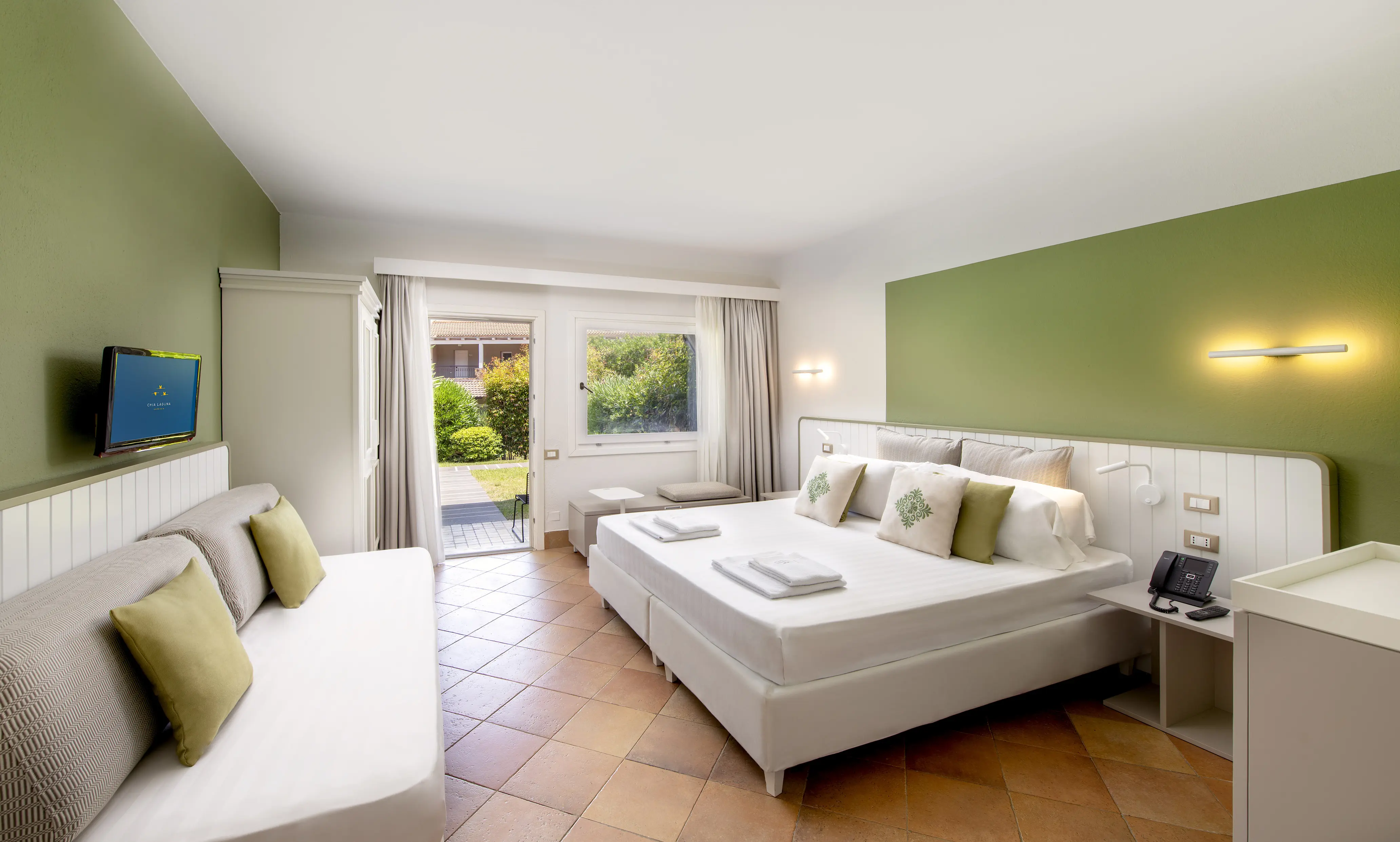Le nostre camera familiari sono progettate specificamente per ospitare famiglie. Sono dotate di un piccolo giardino, una camera al piano terra e un’altra camera al piano superiore. I due piani sono collegati tramite scale.